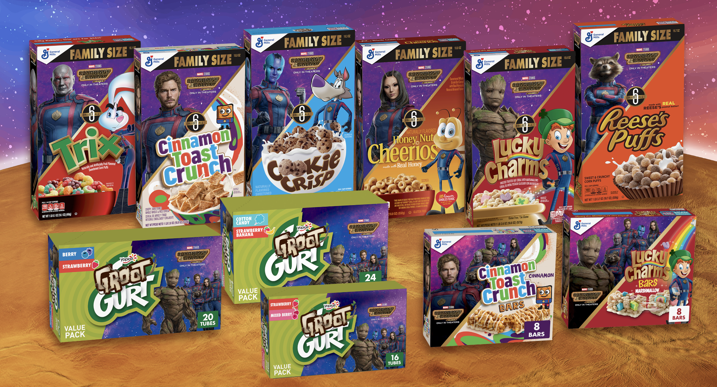 Ideated the cereal mascots to be seen with the Guardians of the Galaxy uniform on the cereal box.